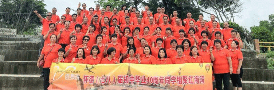 東莞懷德(七八)屆初中40周年同學聚會,大家歡聚一堂。穿著由哈馬校服設計的Polo衫相聚在紅海灣,緬懷昔日學生時代的往事回首?!静榭丛斍?】
